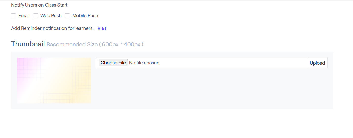 In order to notify your learners via E-mail, WebPush or Mobile Push upon the beginning of class, check your preferred boxes.