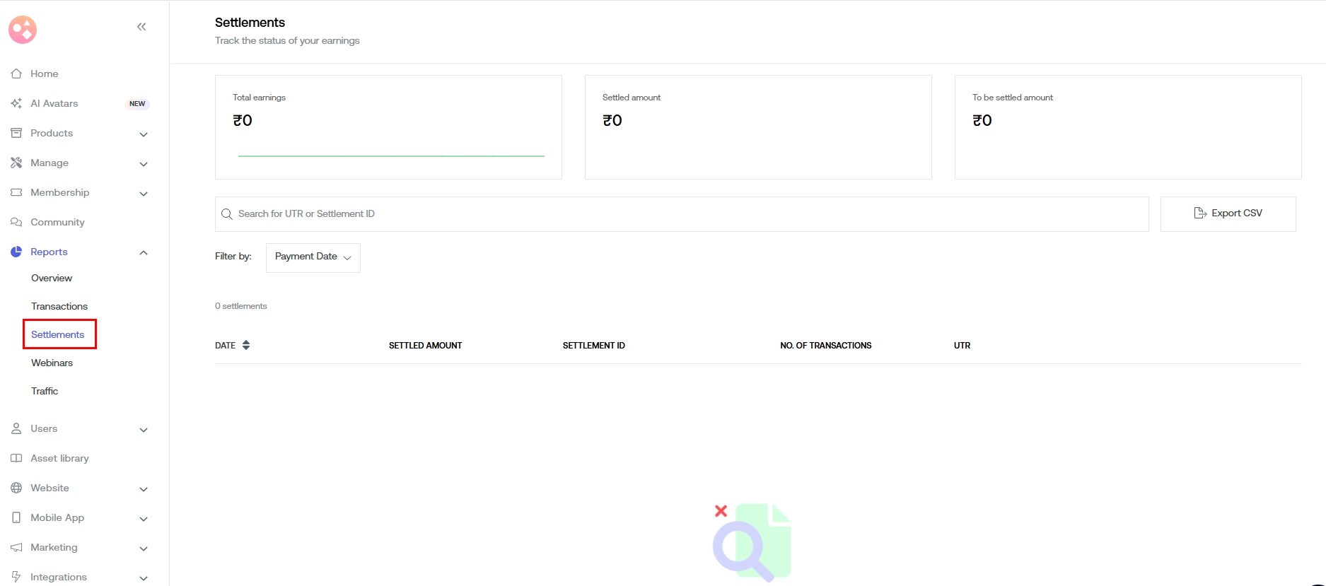 The Settlement section provides a financial overview of your earnings from course sales, membership, digital product, telegram. Settlement refers to the process of transferring funds from sales to your account.