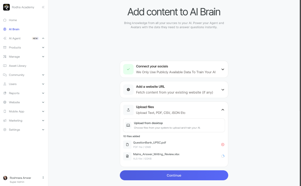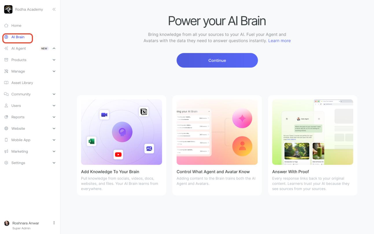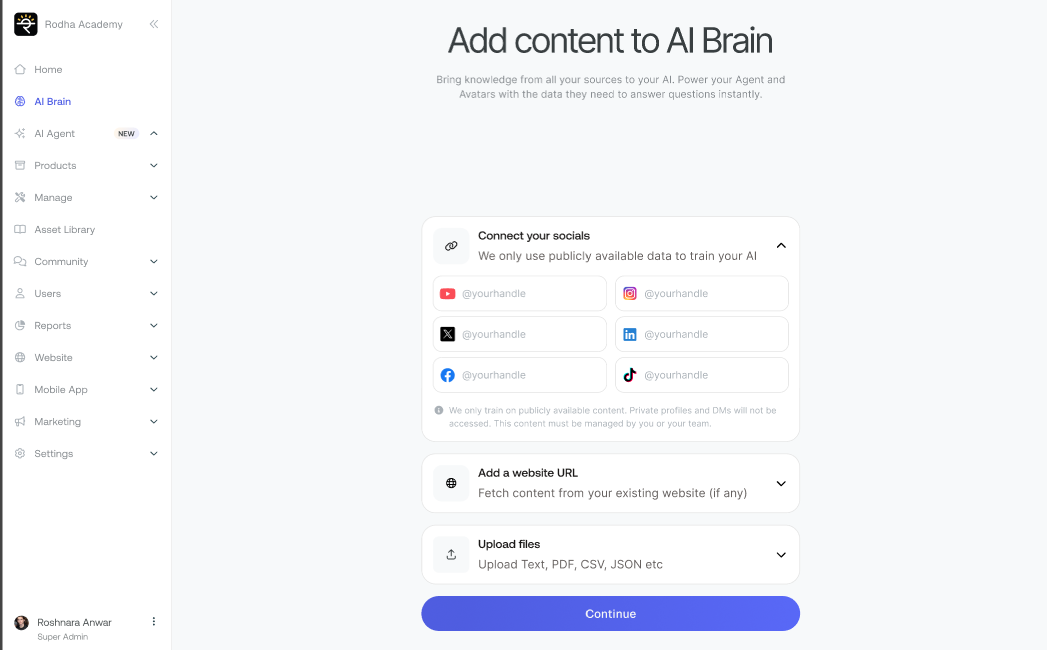 Keeping your AI Brain updated ensures that your Agent and Avatar always sound accurate, and aligned with your expertise. You can manage your content in two ways: