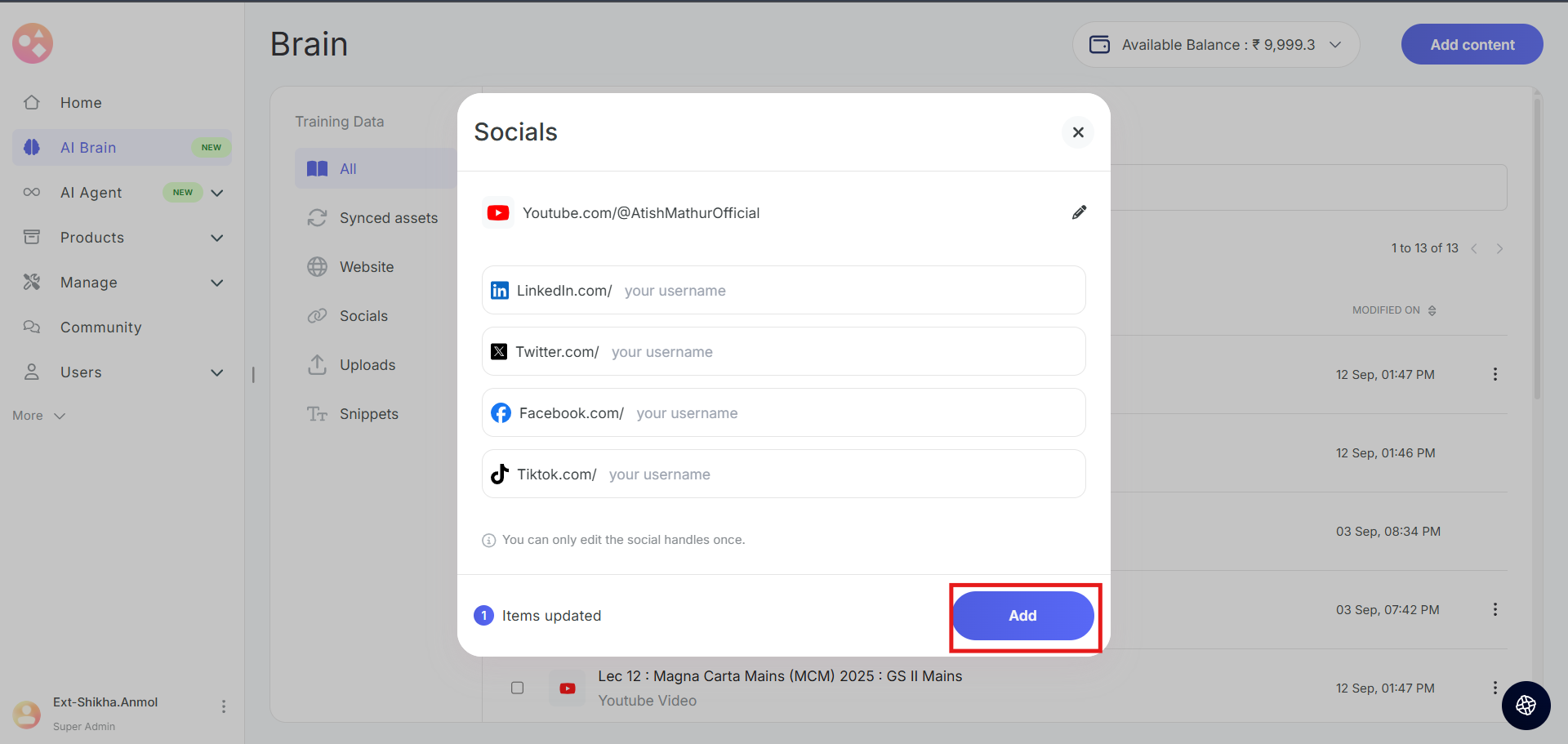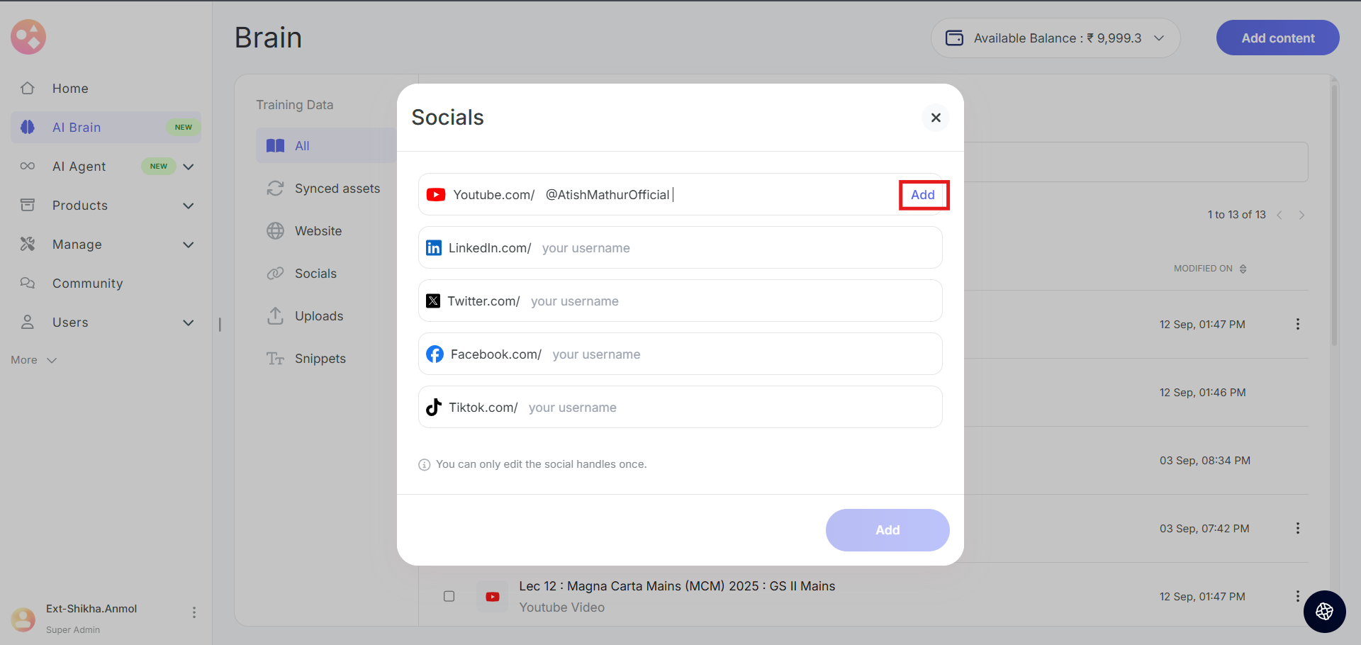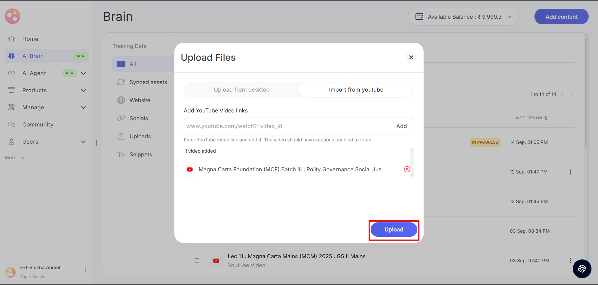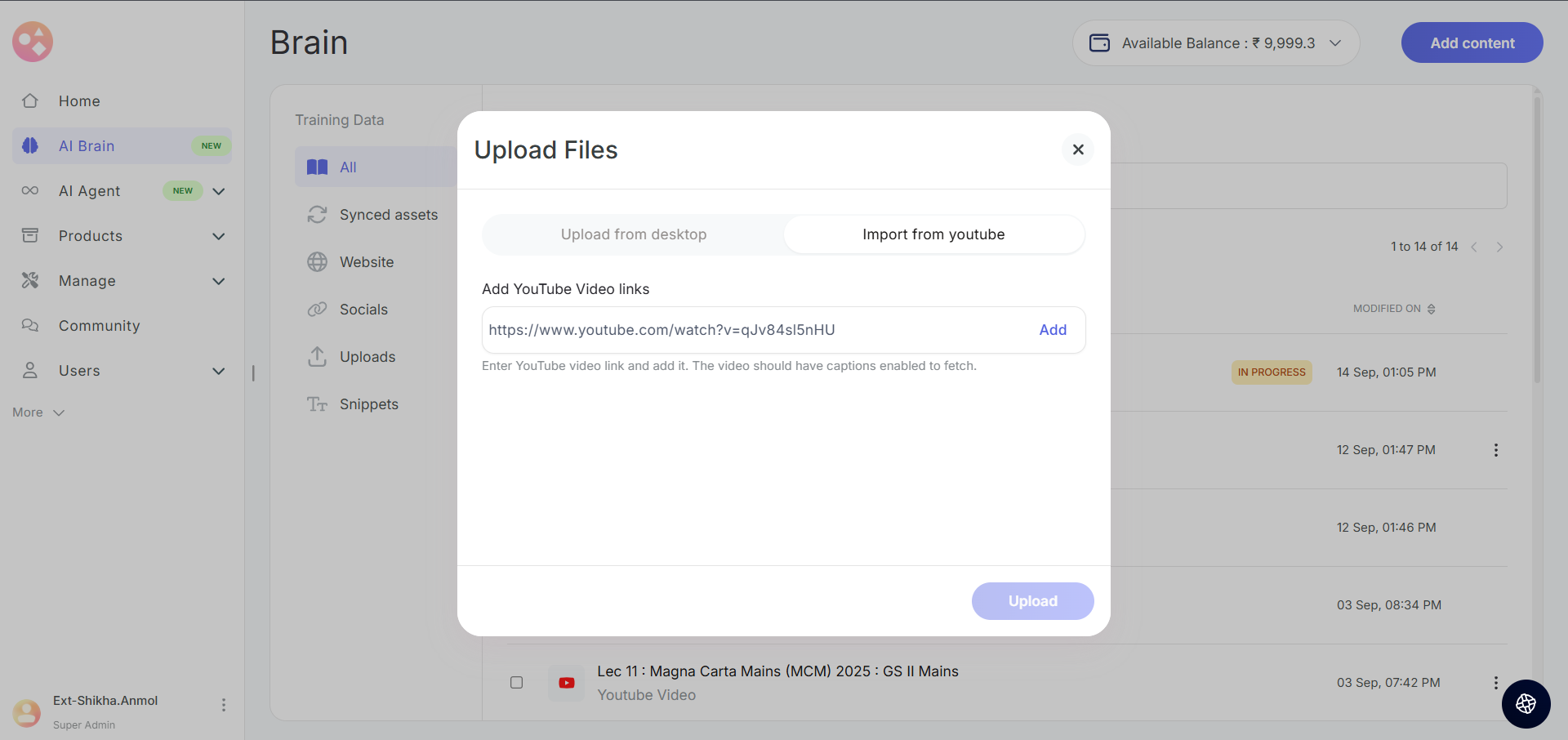 How to add YouTube videos to AI Brain?