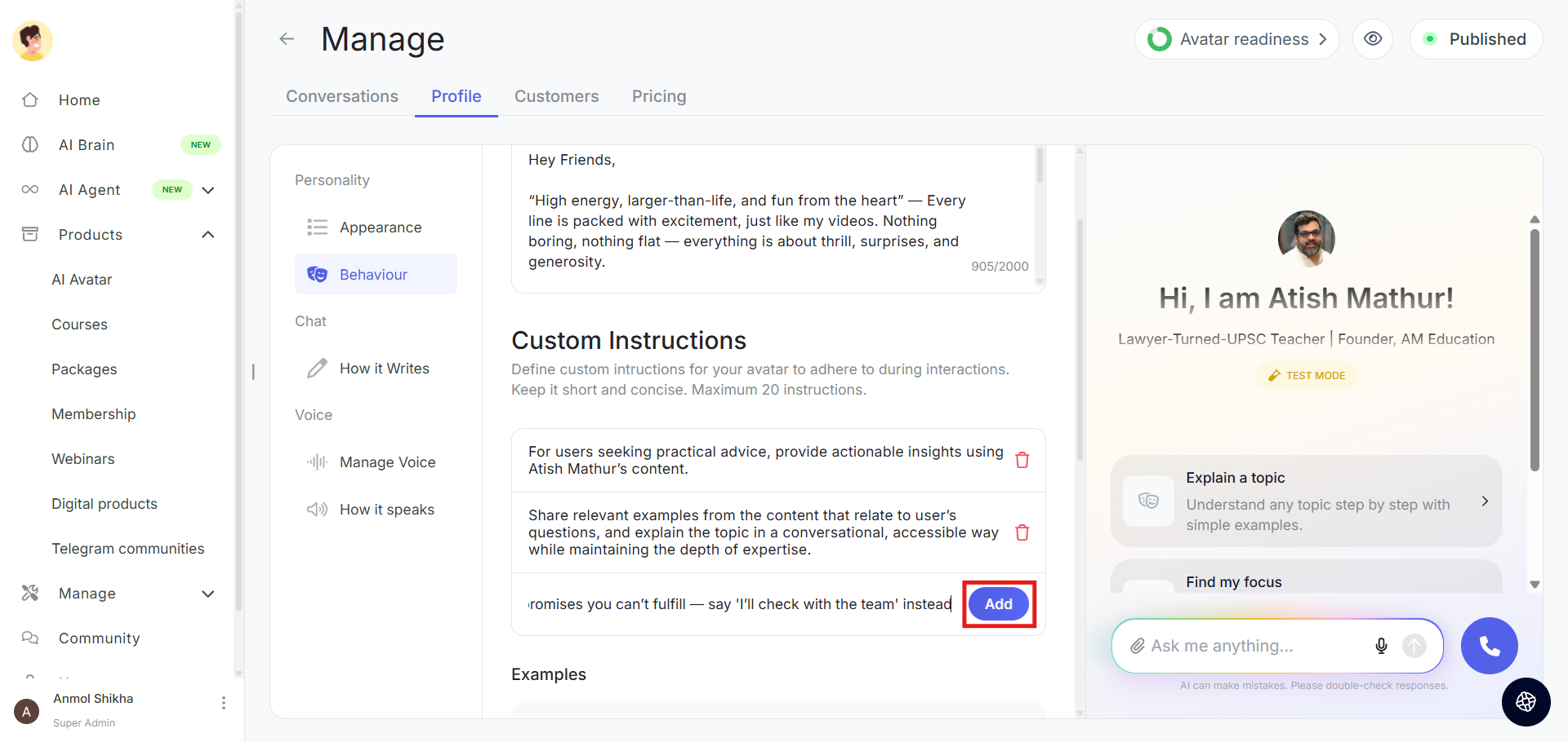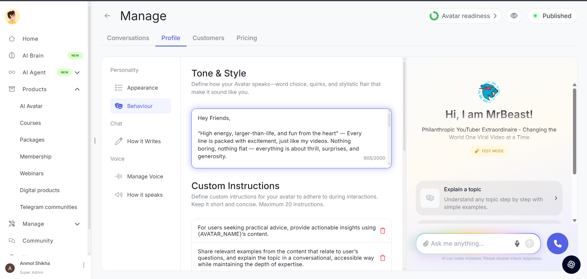 Custom instructions allow you to give specific guidelines to your avatar about how it should behave in different scenarios.