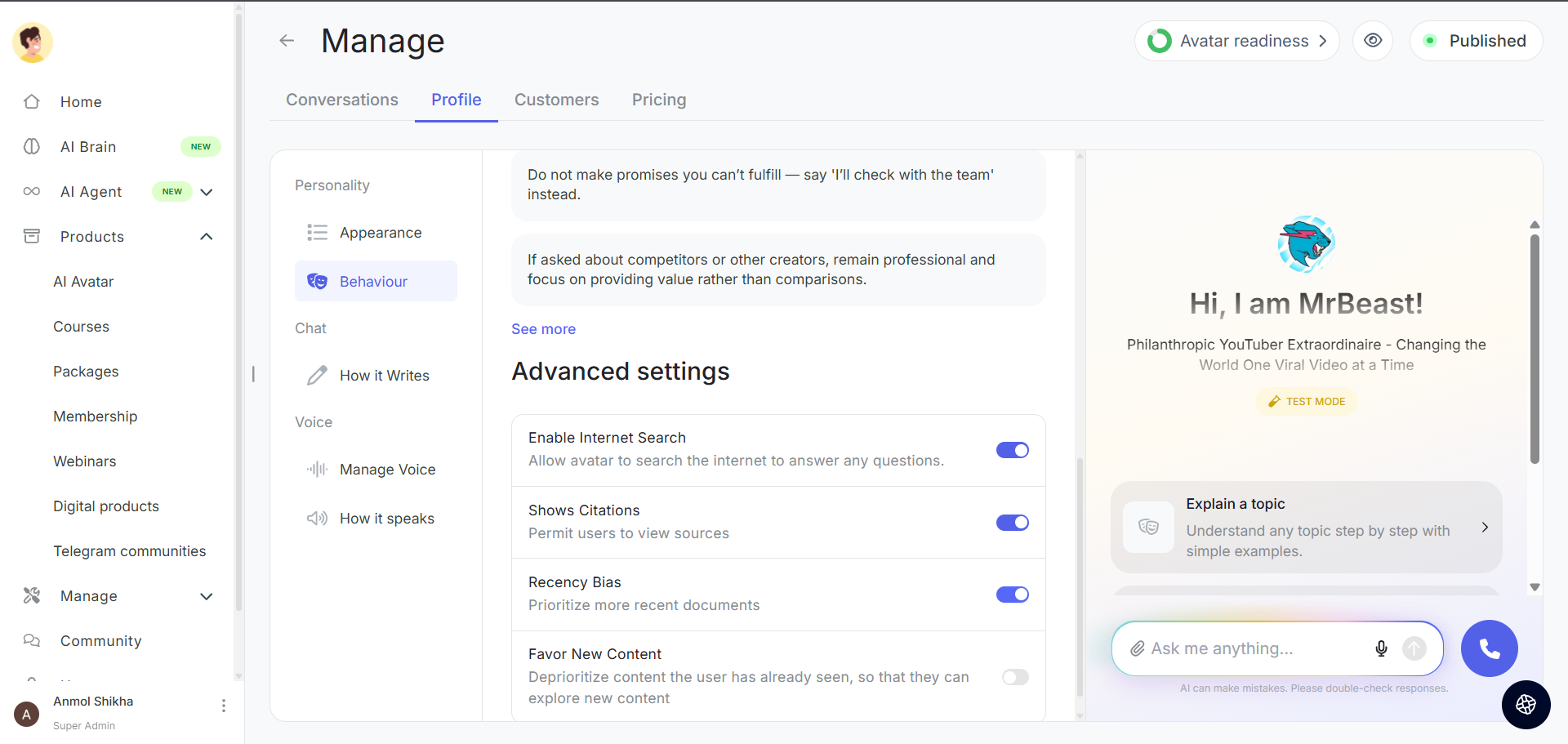 The Behavior settings allow you to define how your AI Avatar interacts with users. You can customize the tone, style, conversation approach, and advanced features to create a personalized experience that reflects your unique teaching style and brand personality.