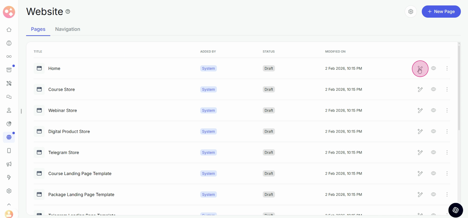 You'll be redirected to the Website section where you can see all the pages of your website. These pages are created as drafts so that you can view, make changes, and publish them whenever you want.