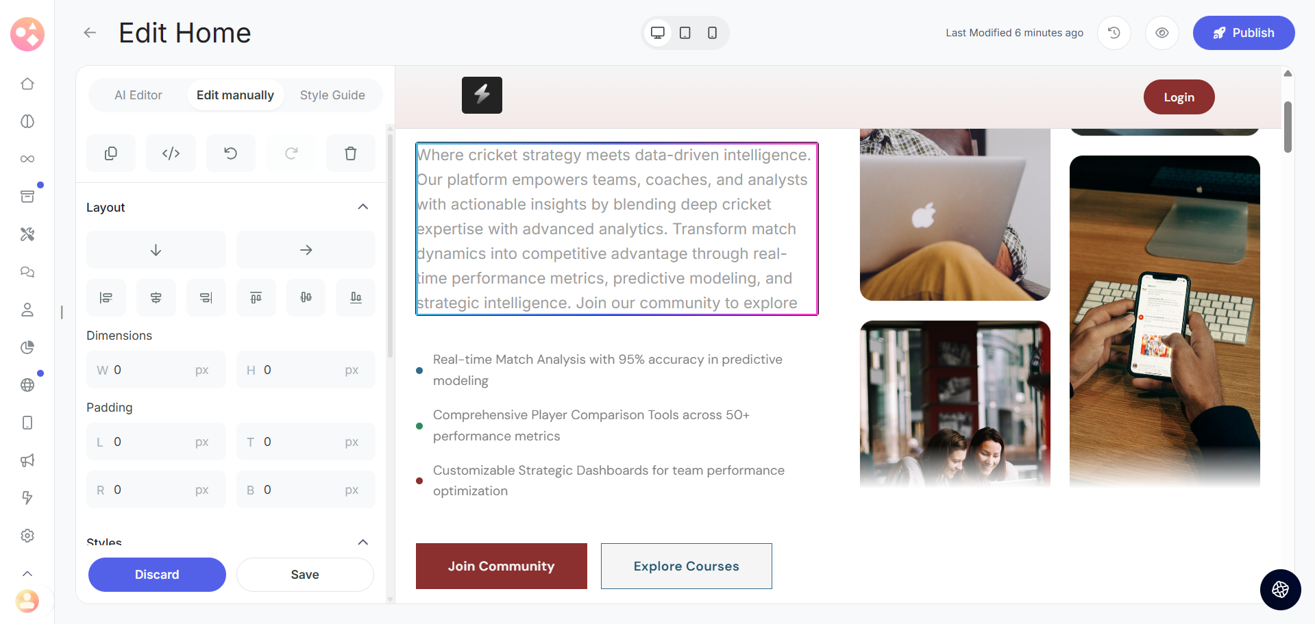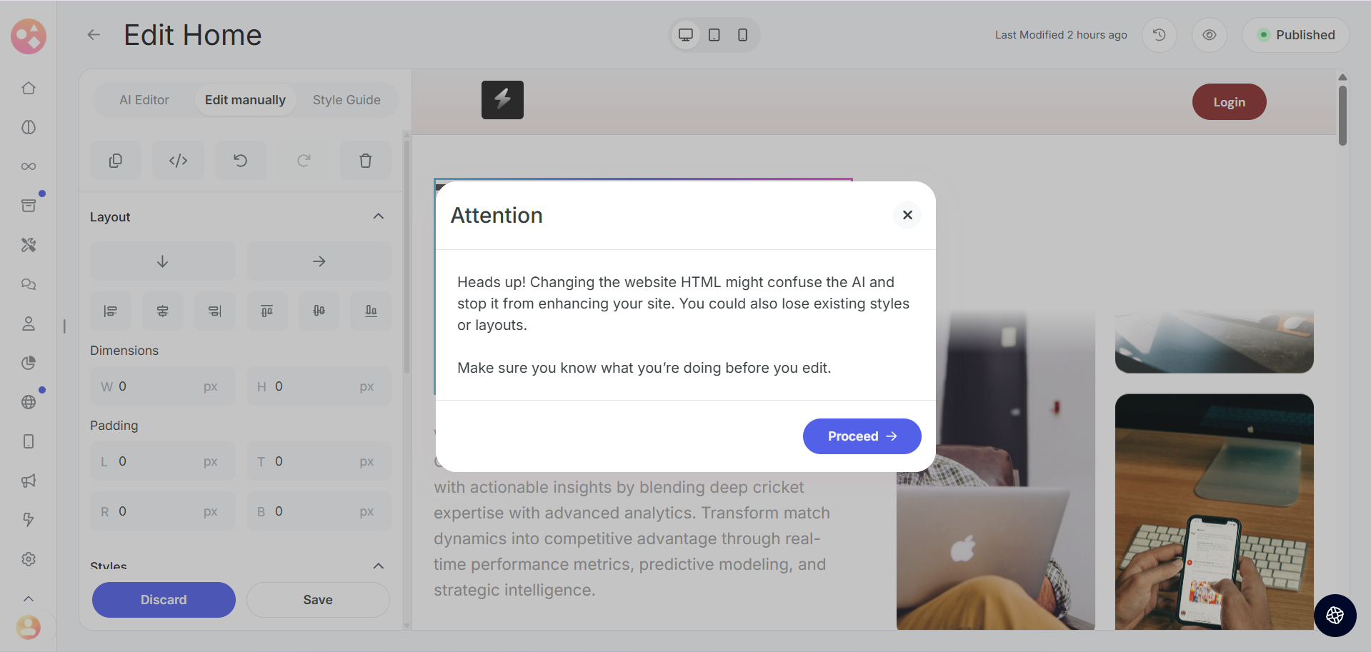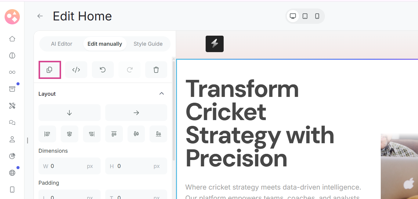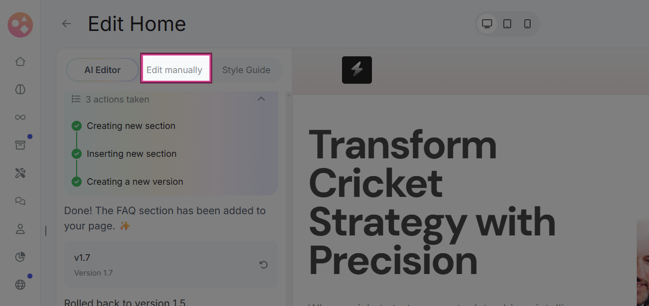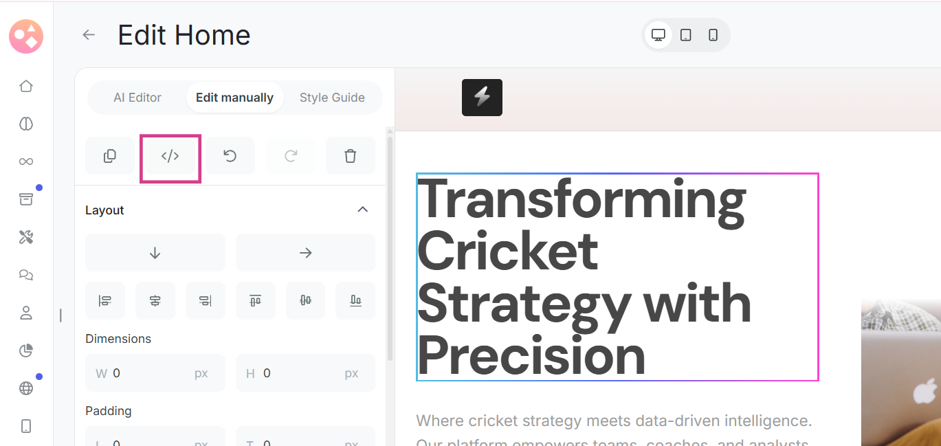 The Edit Manually tab empowers you with granular control to adjust layout, alignment, spacing, dimensions, colors, and text content directly without any coding required. Make pixel-perfect adjustments to individual elements, update text sections by typing directly, and fine-tune your design exactly how you want it. This tab is perfect for making specific, detailed changes to your page after AI generation or as an alternative to code editing.