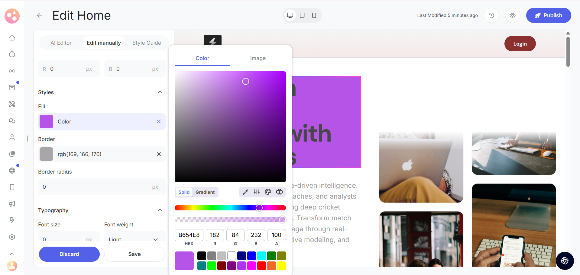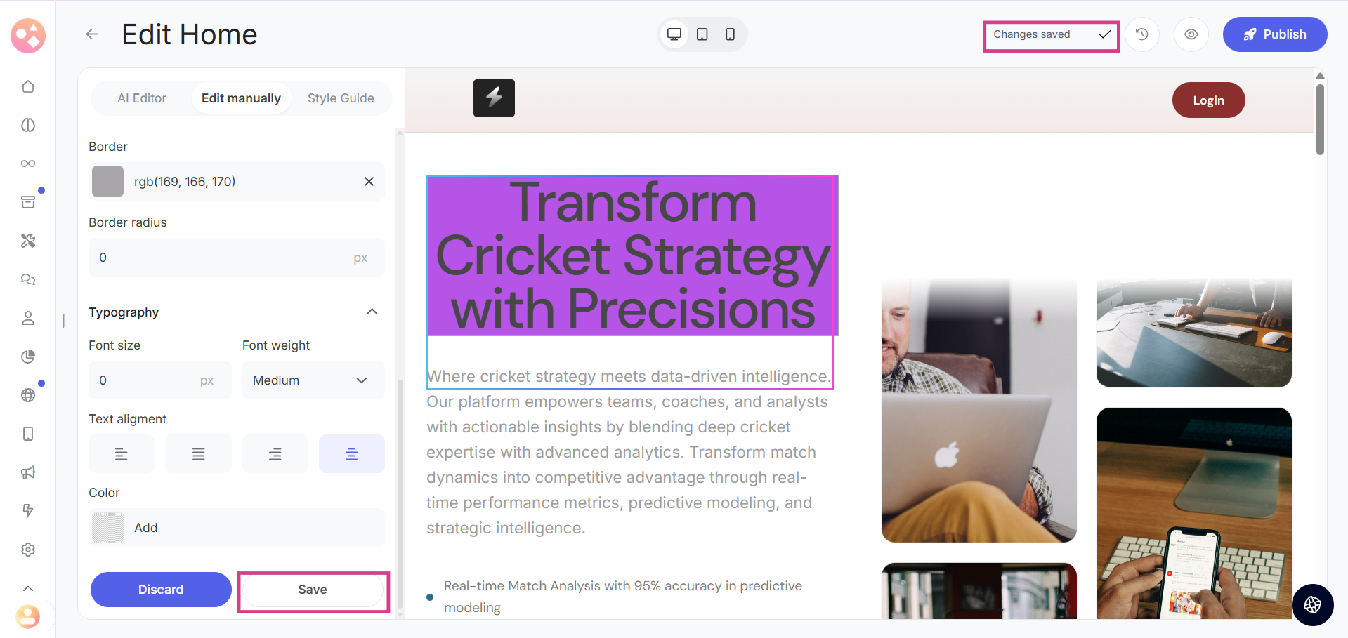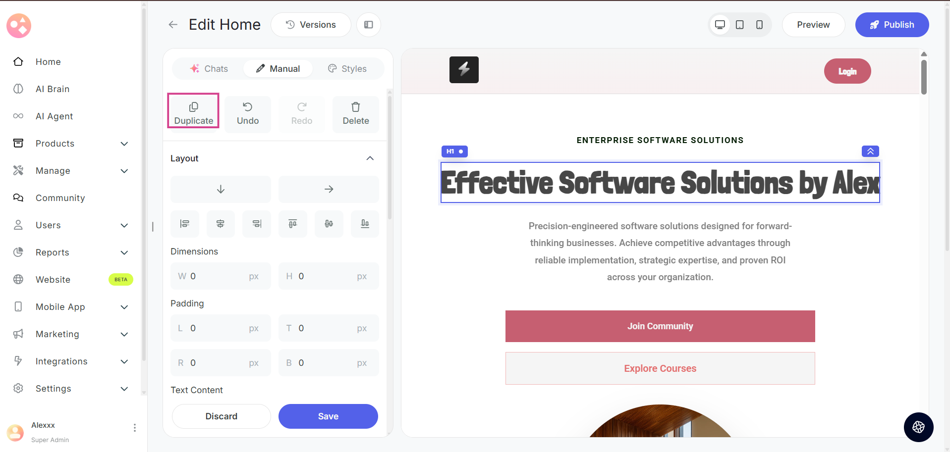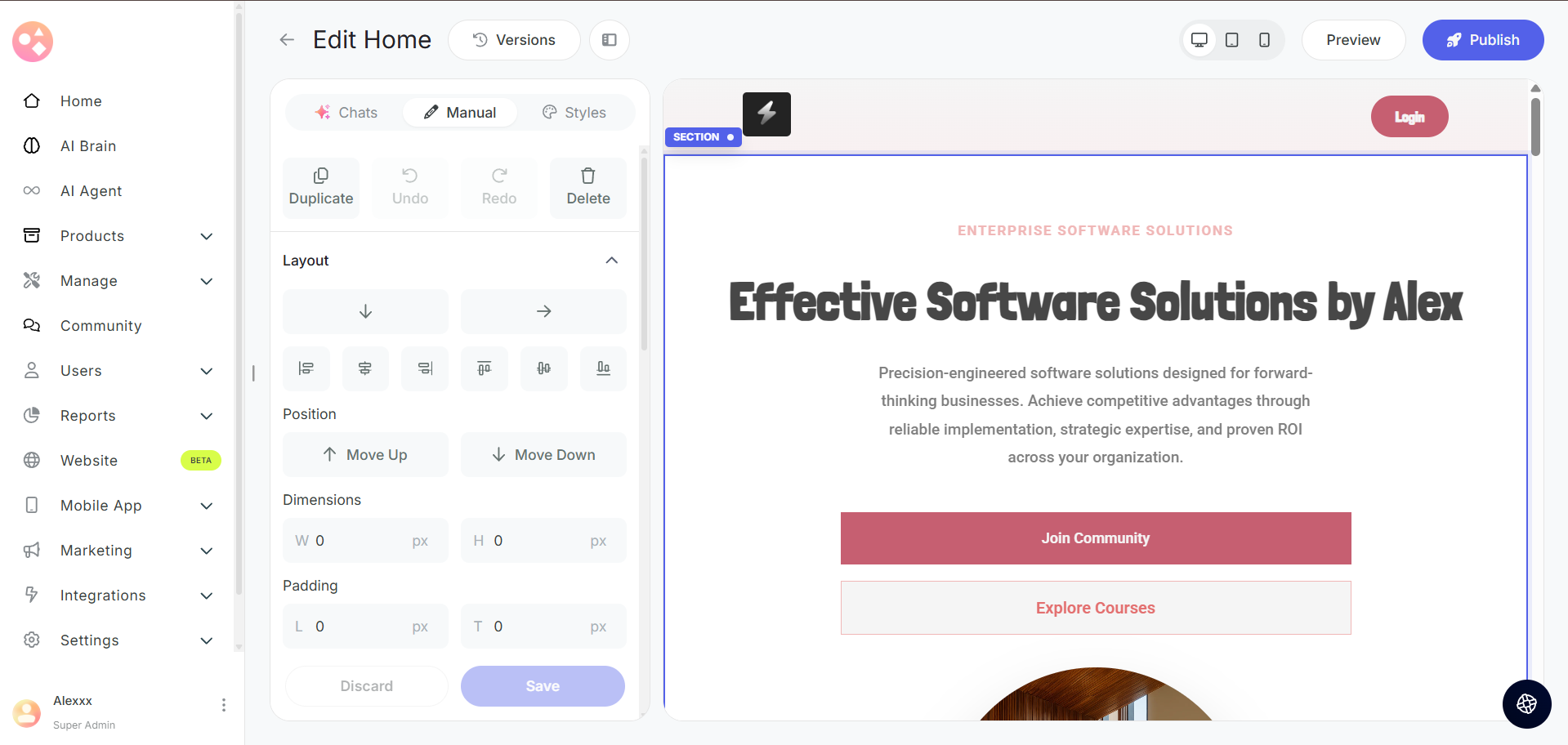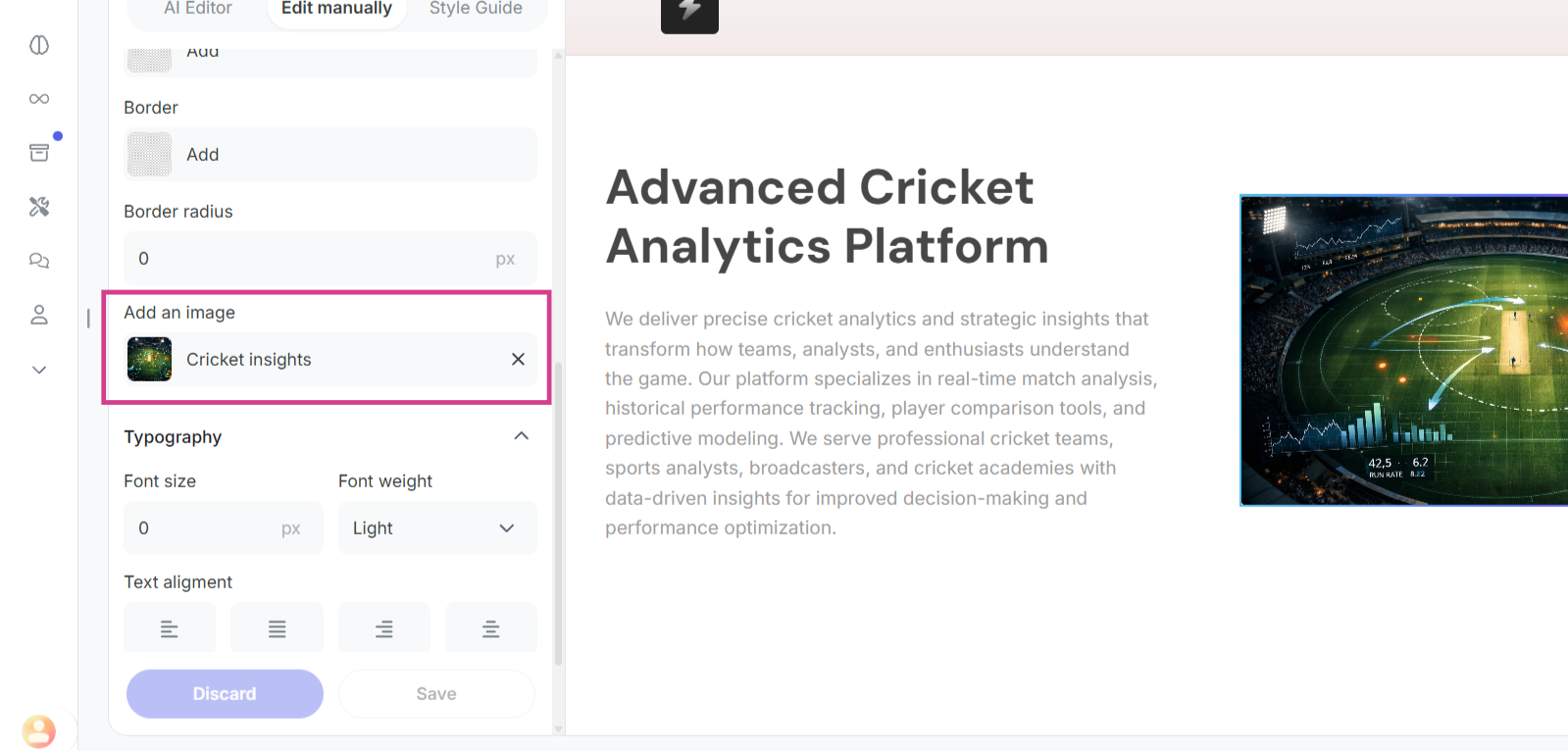 The Edit Manually tab empowers you with granular control to adjust layout, alignment, spacing, dimensions, colors, and text content directly without any coding required. Make pixel-perfect adjustments to individual elements, update text sections by typing directly, and fine-tune your design exactly how you want it. This tab is perfect for making specific, detailed changes to your page after AI generation or as an alternative to code editing.