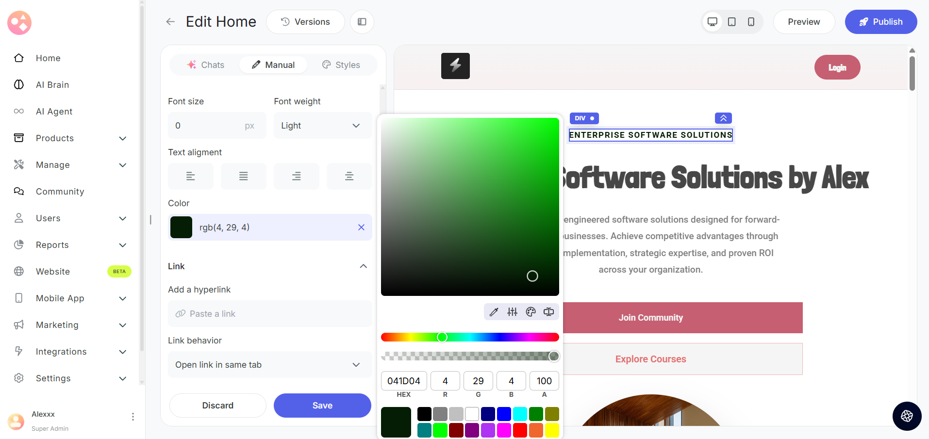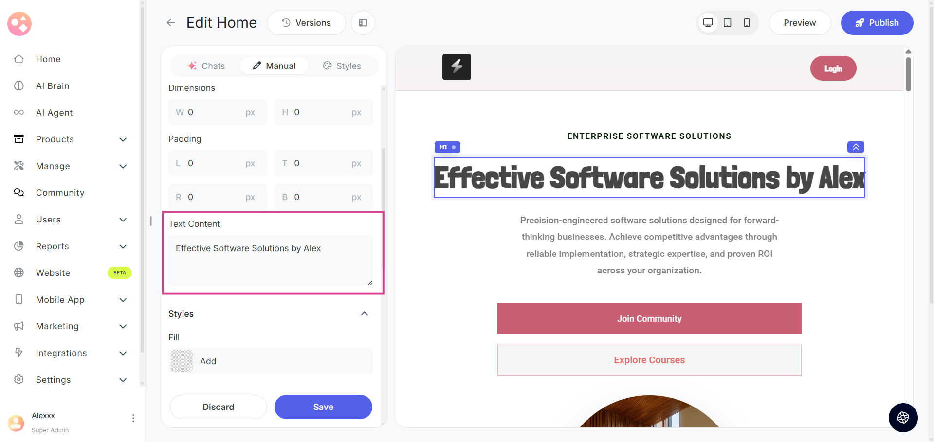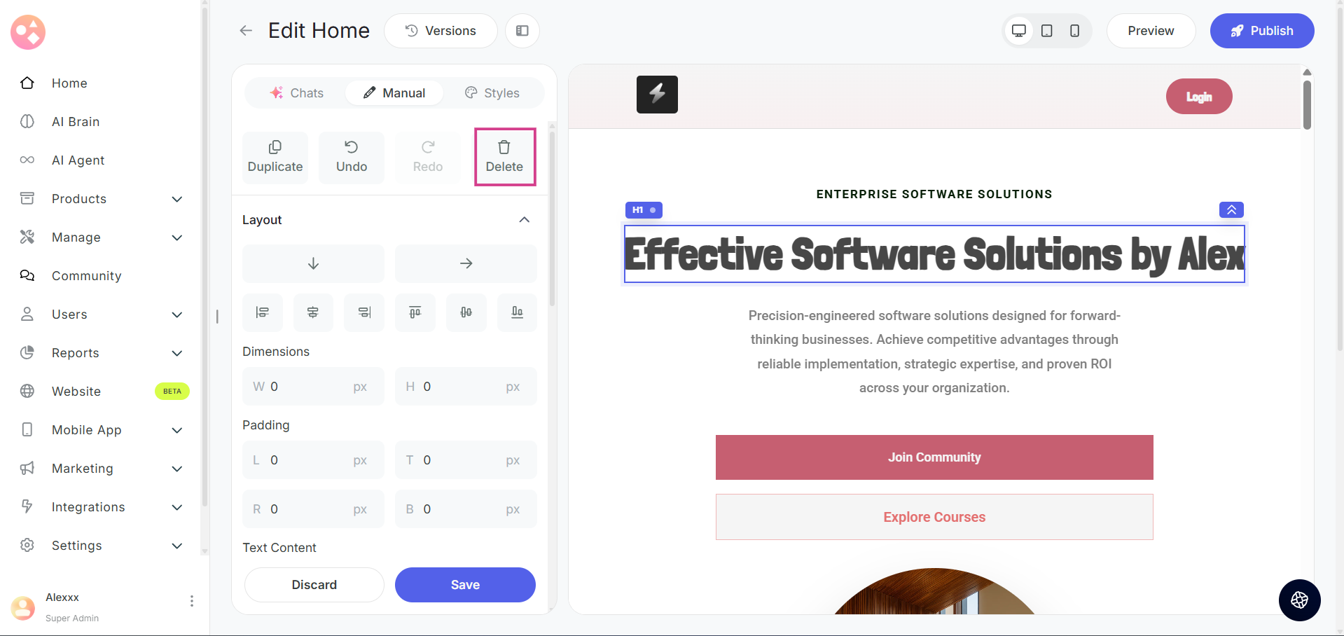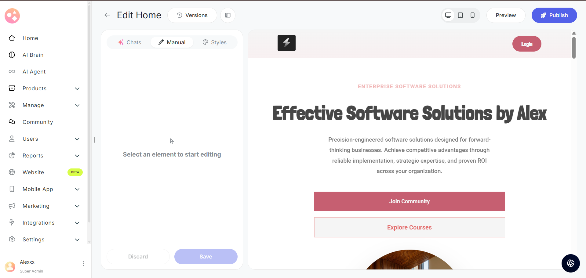 The Edit Manually tab empowers you with granular control to adjust layout, alignment, spacing, dimensions, colors, and text content directly without any coding required. Make pixel-perfect adjustments to individual elements, update text sections by typing directly, and fine-tune your design exactly how you want it. This tab is perfect for making specific, detailed changes to your page after AI generation or as an alternative to code editing.