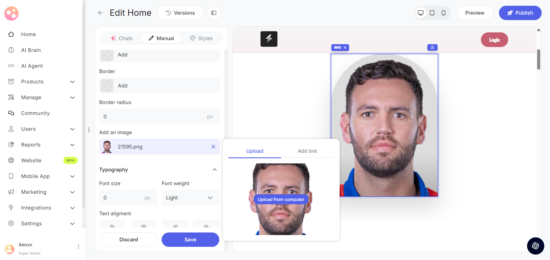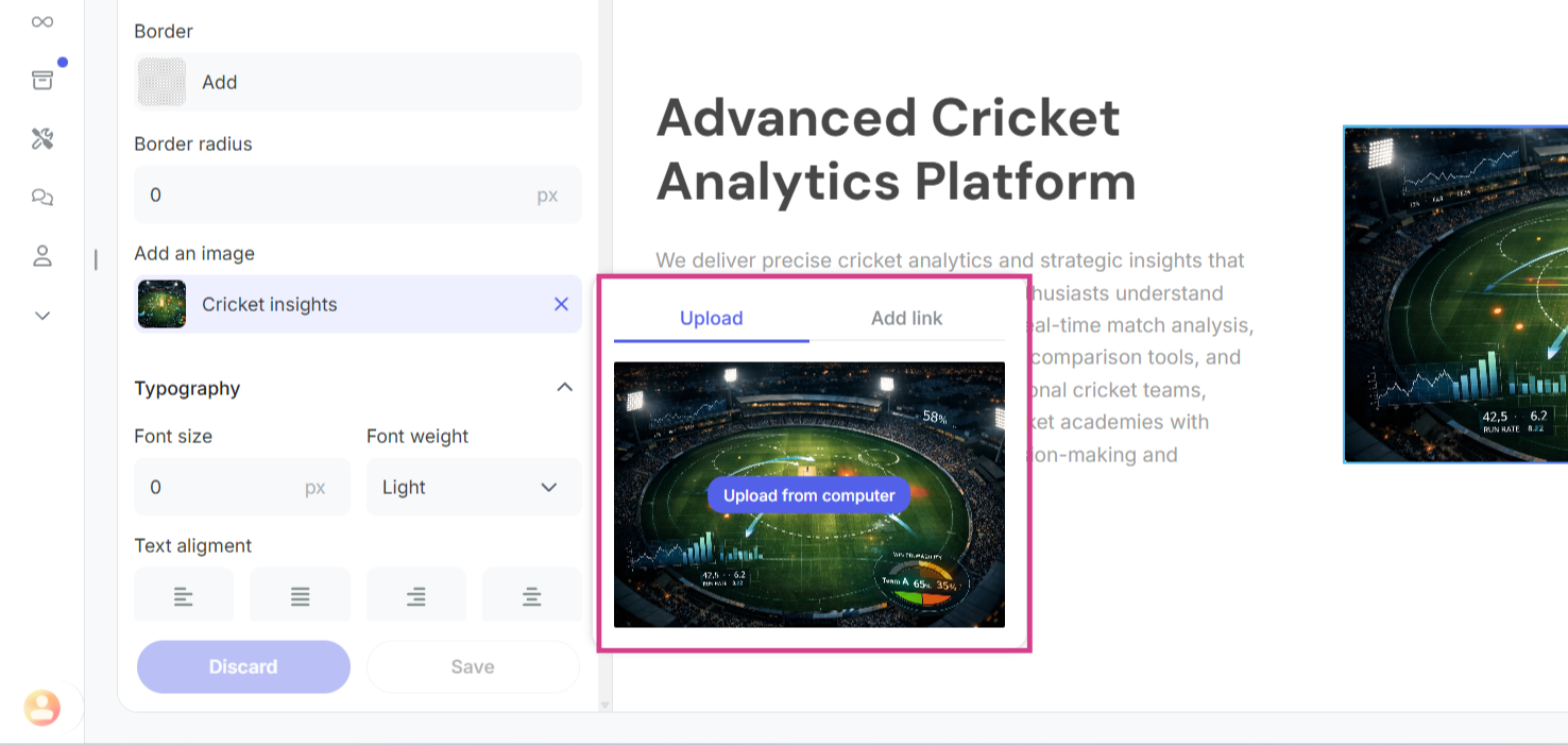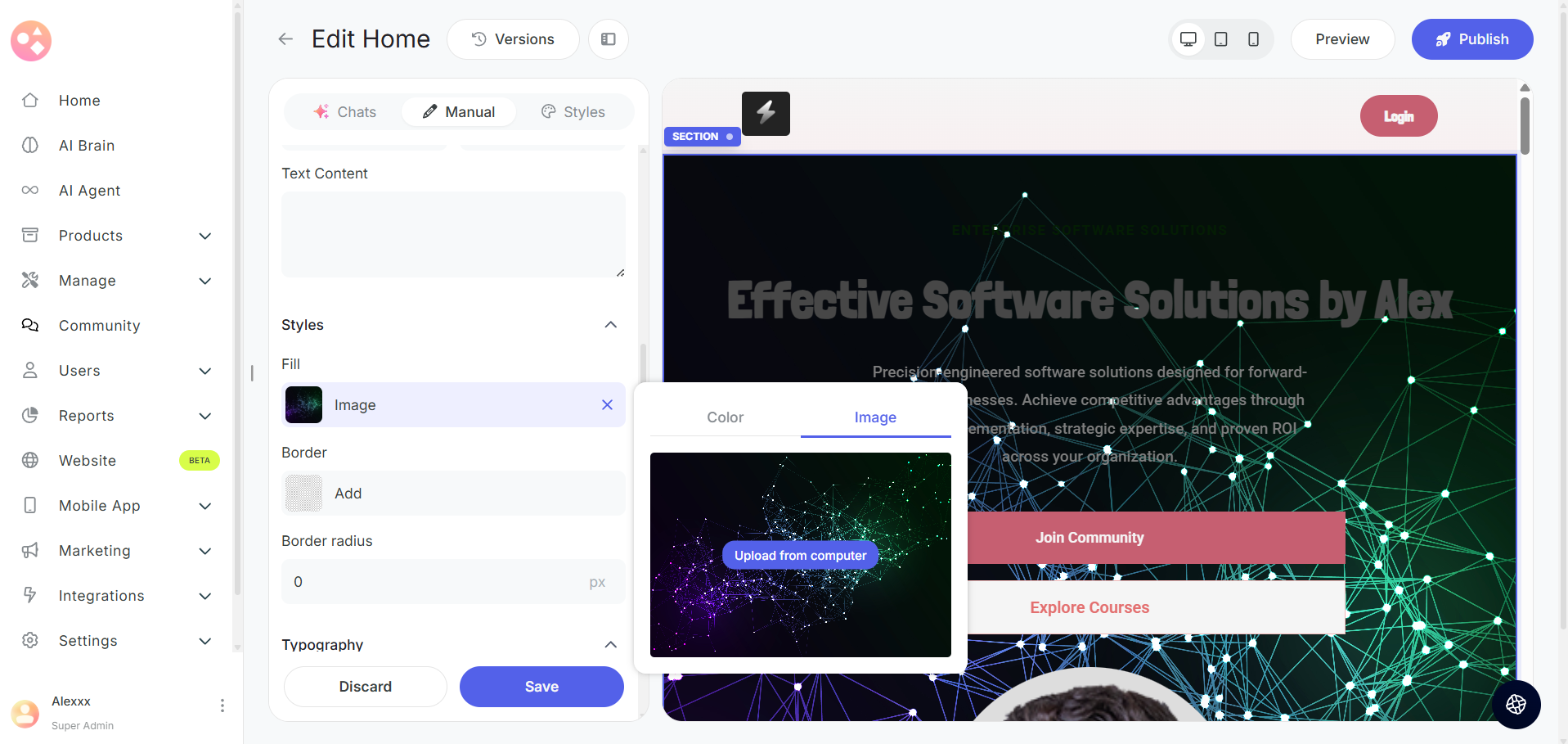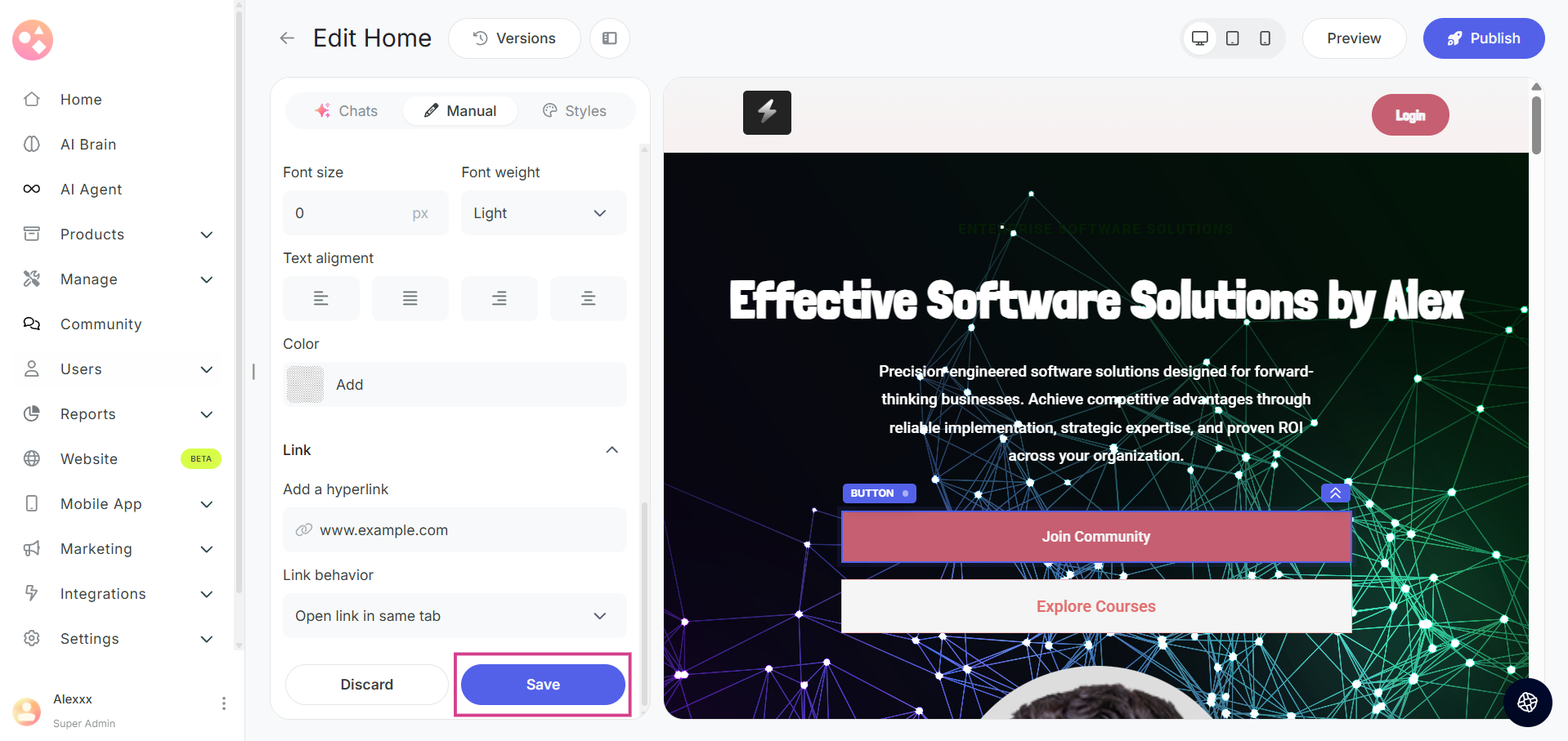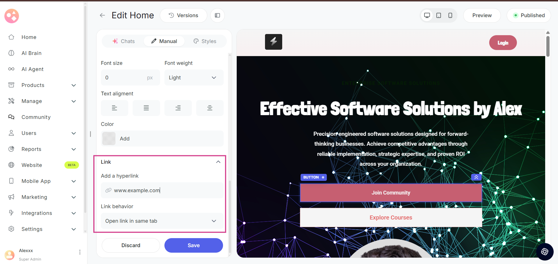 The Edit Manually tab empowers you with granular control to adjust layout, alignment, spacing, dimensions, colors, and text content directly without any coding required. Make pixel-perfect adjustments to individual elements, update text sections by typing directly, and fine-tune your design exactly how you want it. This tab is perfect for making specific, detailed changes to your page after AI generation or as an alternative to code editing.