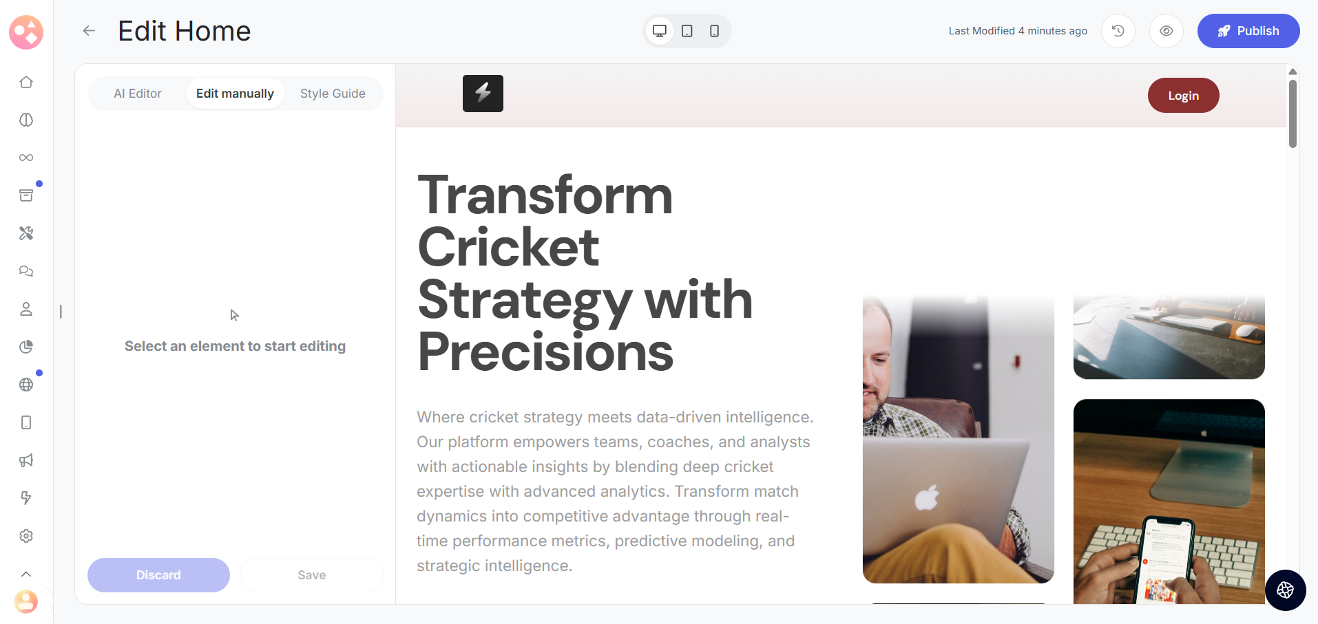 For more precise control over your page design, the Edit Manually tab allows you to make detailed adjustments without needing any code.