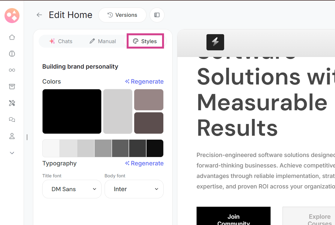 The Style Guide tab lets you transform your entire page's appearance by regenerating color schemes, experimenting with different fonts, and resetting to default styles. Make global design changes that affect your entire page aesthetic, try unlimited design variations, and maintain visual consistency across your website. This tab is perfect for quickly changing your page's mood and branding without touching individual elements.