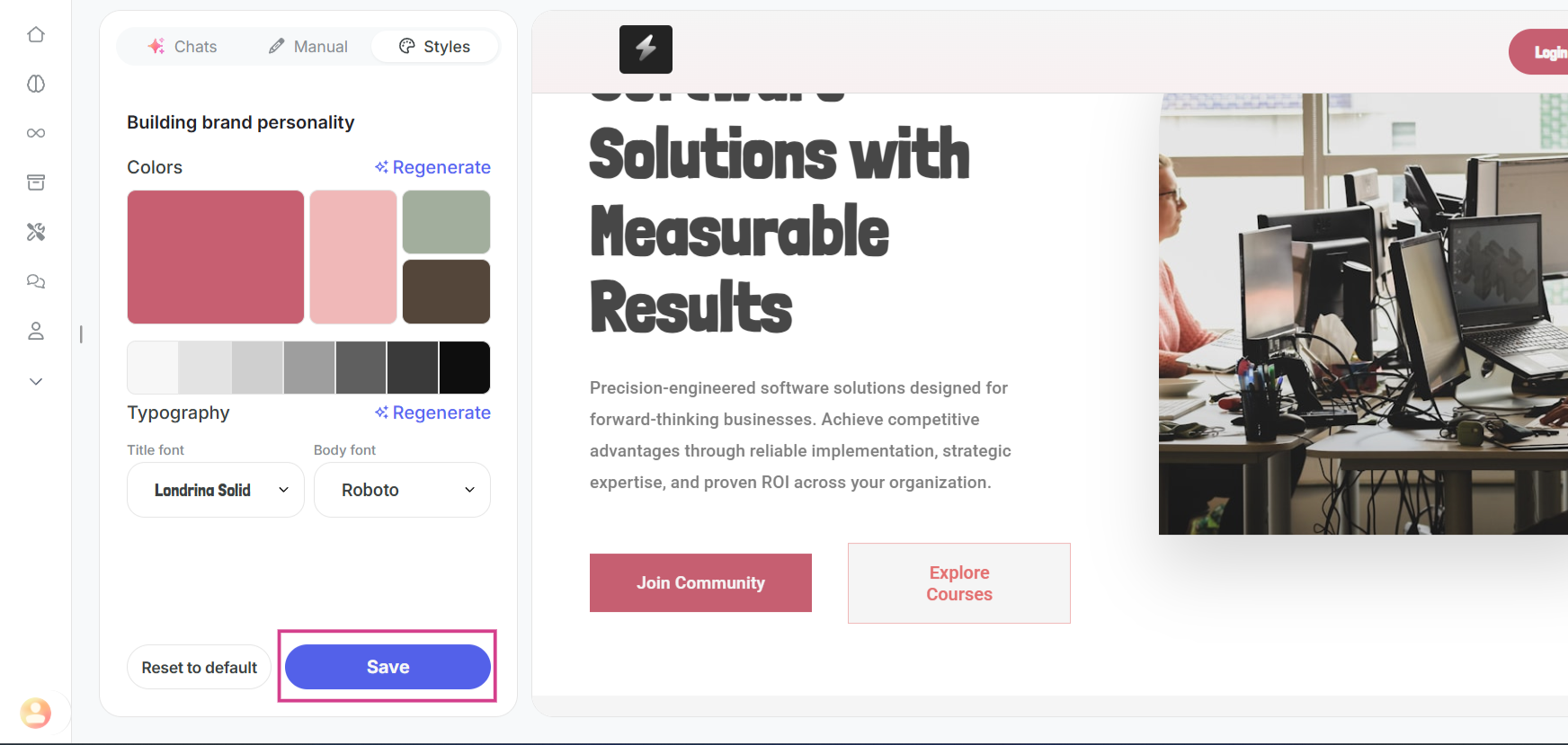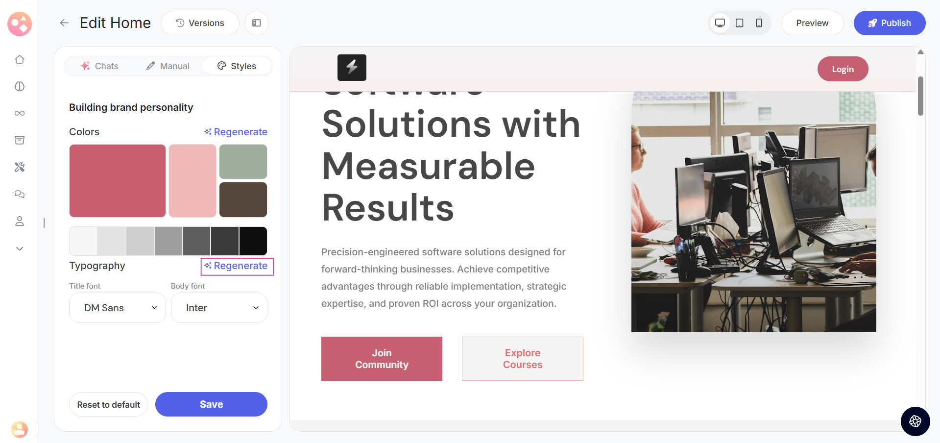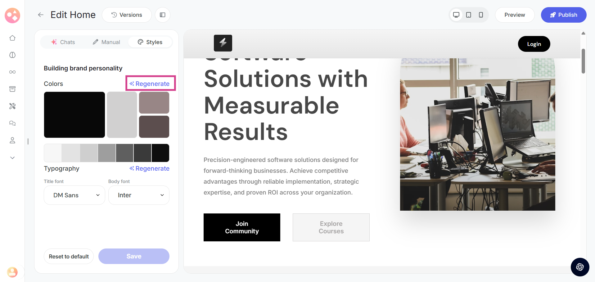 Simply click on the regenerate option and let the system generate new color combinations that match your brand and content.