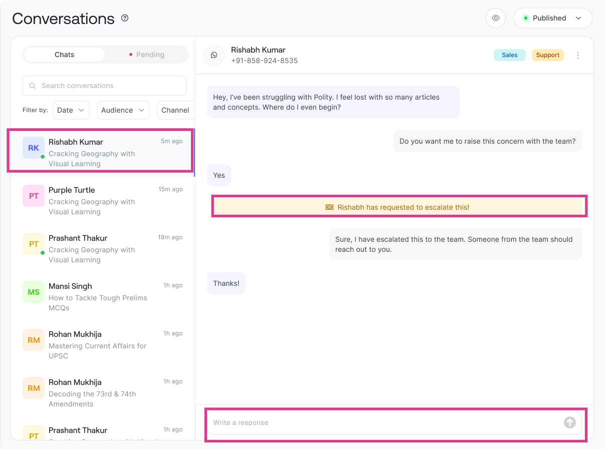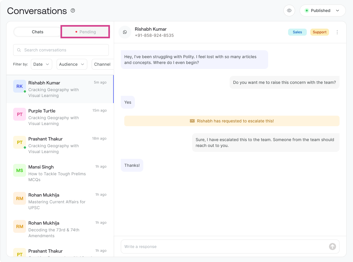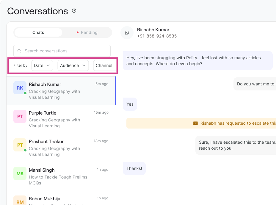 Once you get notified, you can navigate to the Agent section from your dashboard. Under the Conversations tab, you will see a new tab called Pending. This tab contains all the concerns and issues that learners have raised and escalated to you.