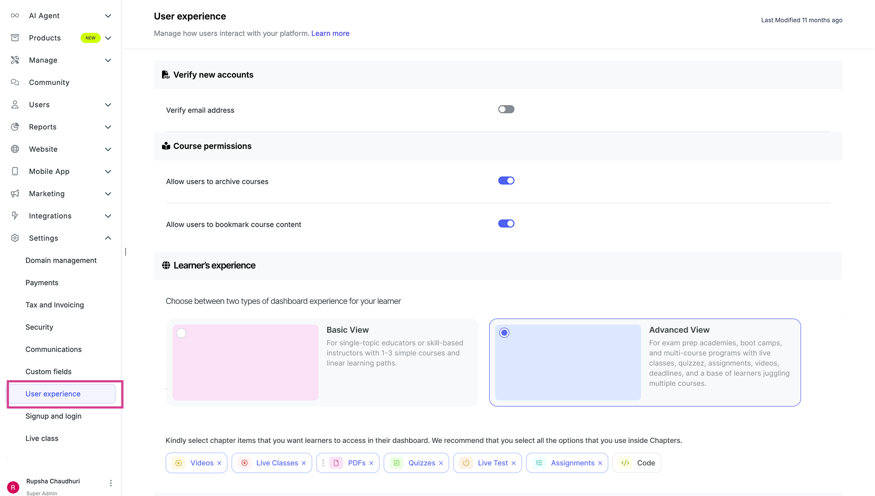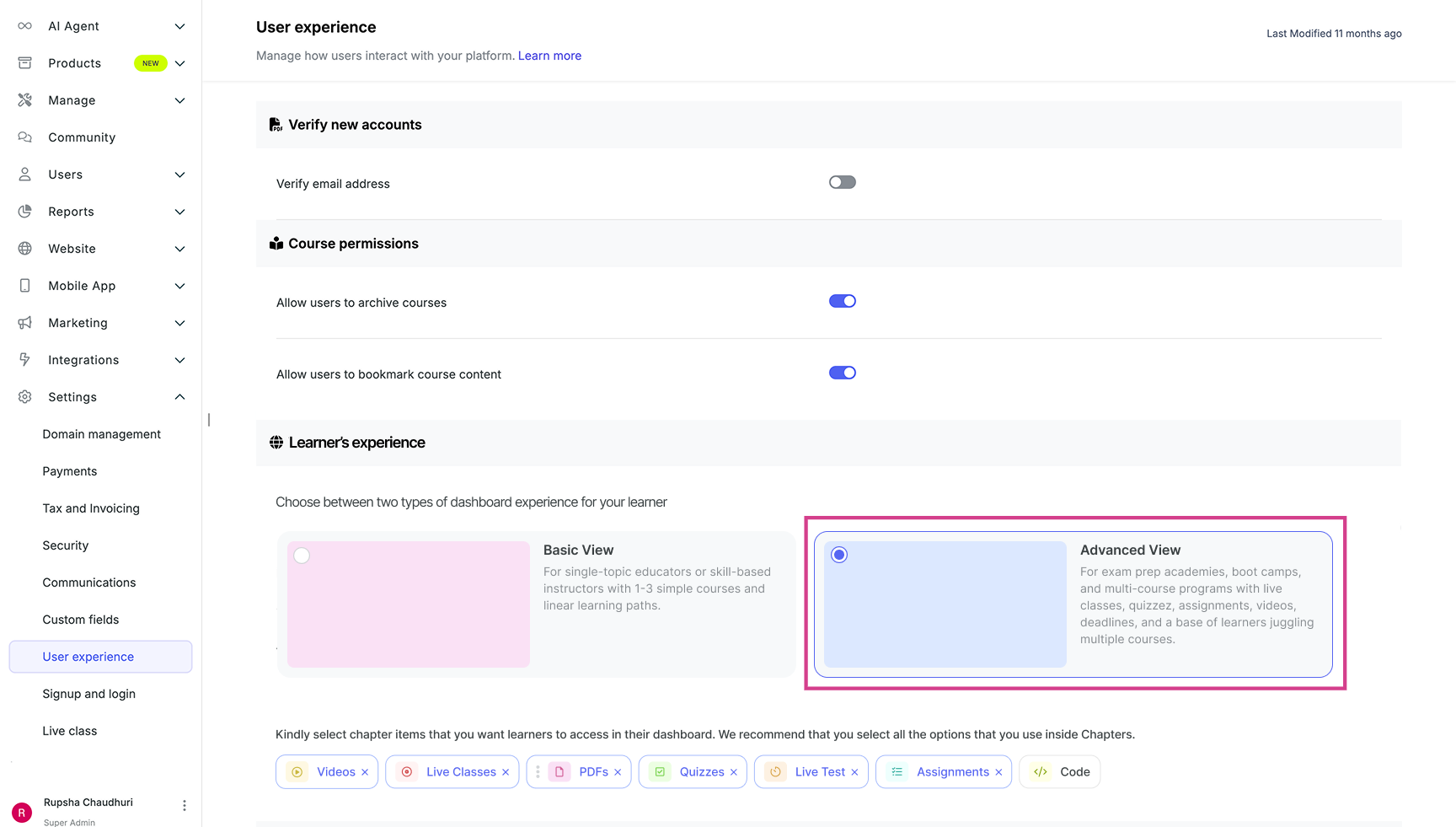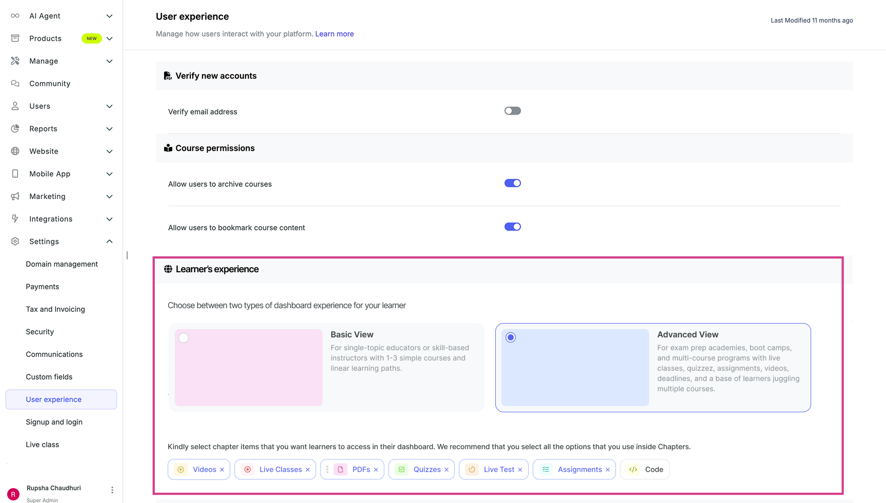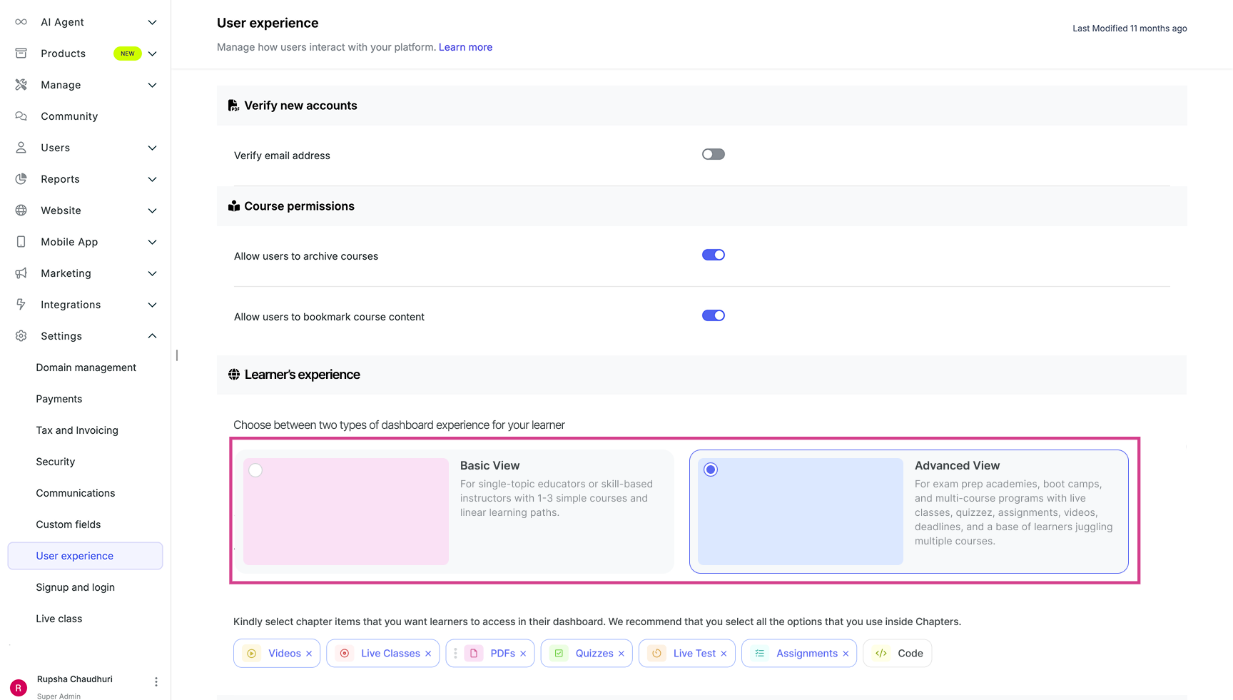 Once you have enabled the advanced view, you can further customize the experience for your learners by selecting items for quick access and organising them according to your priorities. You can select or deselect quick access items, and based on that selection, it will be made visible to your learners.