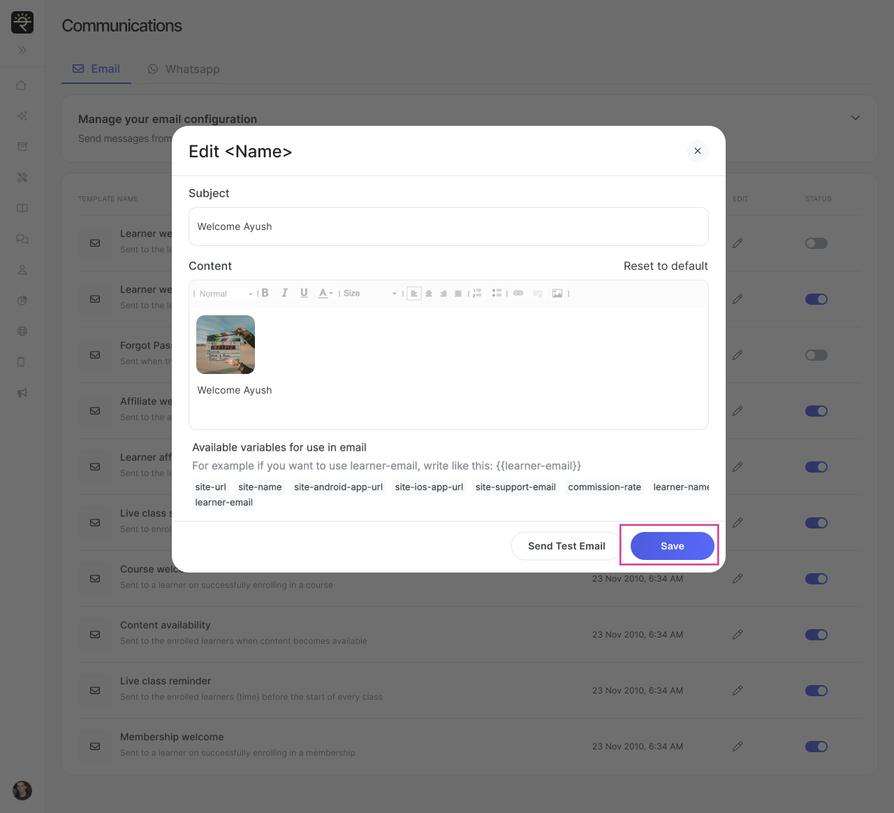 Make your desired changes to the email template and click on 'Save' to apply them. If you want to send a test email to yourself, you can do so by clicking on Send Test Email option.