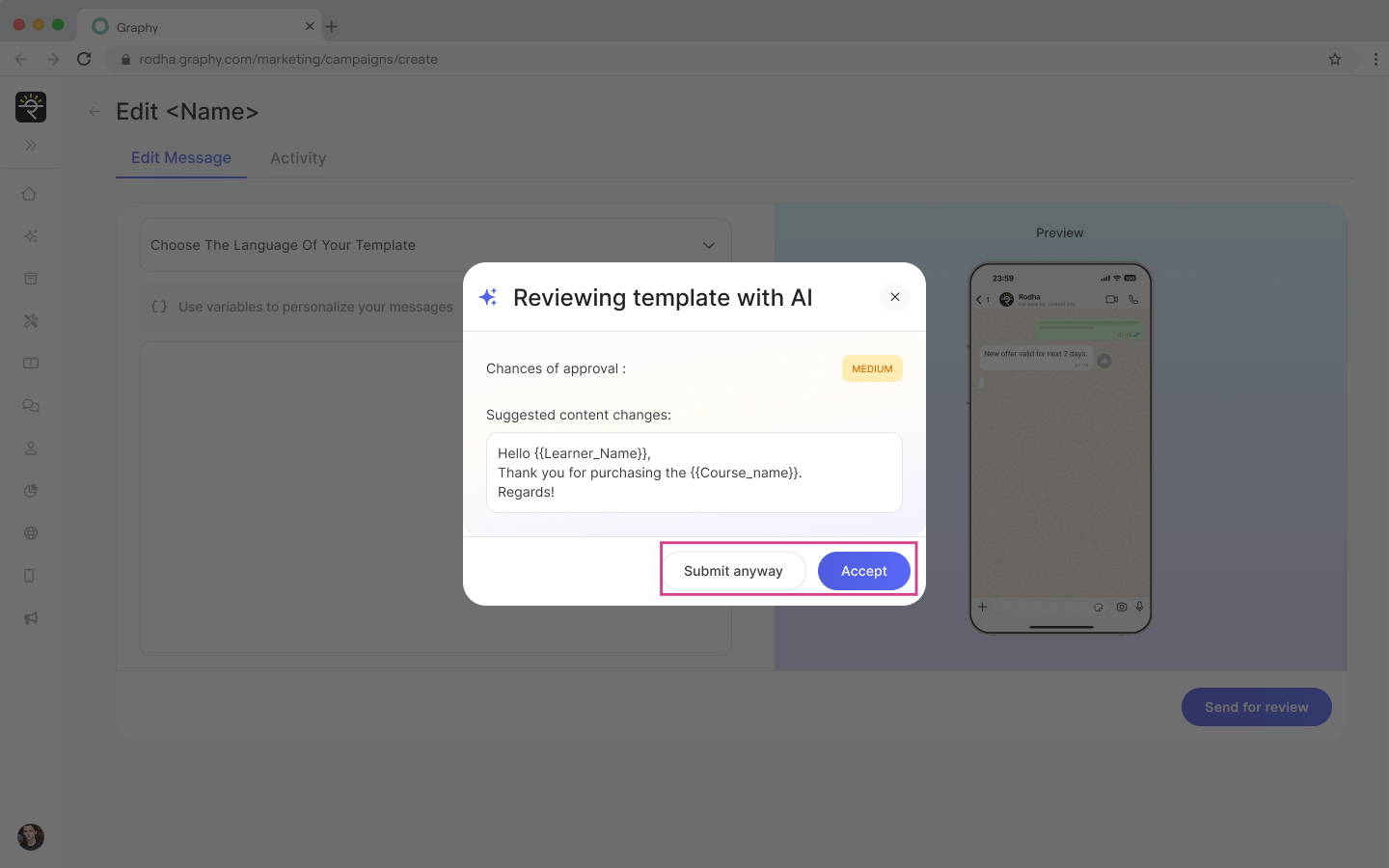 Once you're done making edits, Graphy AI will display a modal which will show the chance of approval for the template and suggest changes to increase the chance of approval. You can accept the suggested changes or click on 'Submit Anyway' if you prefer to keep your original version. Selecting Accept will take you back to the Edit Window where you can edit your message.