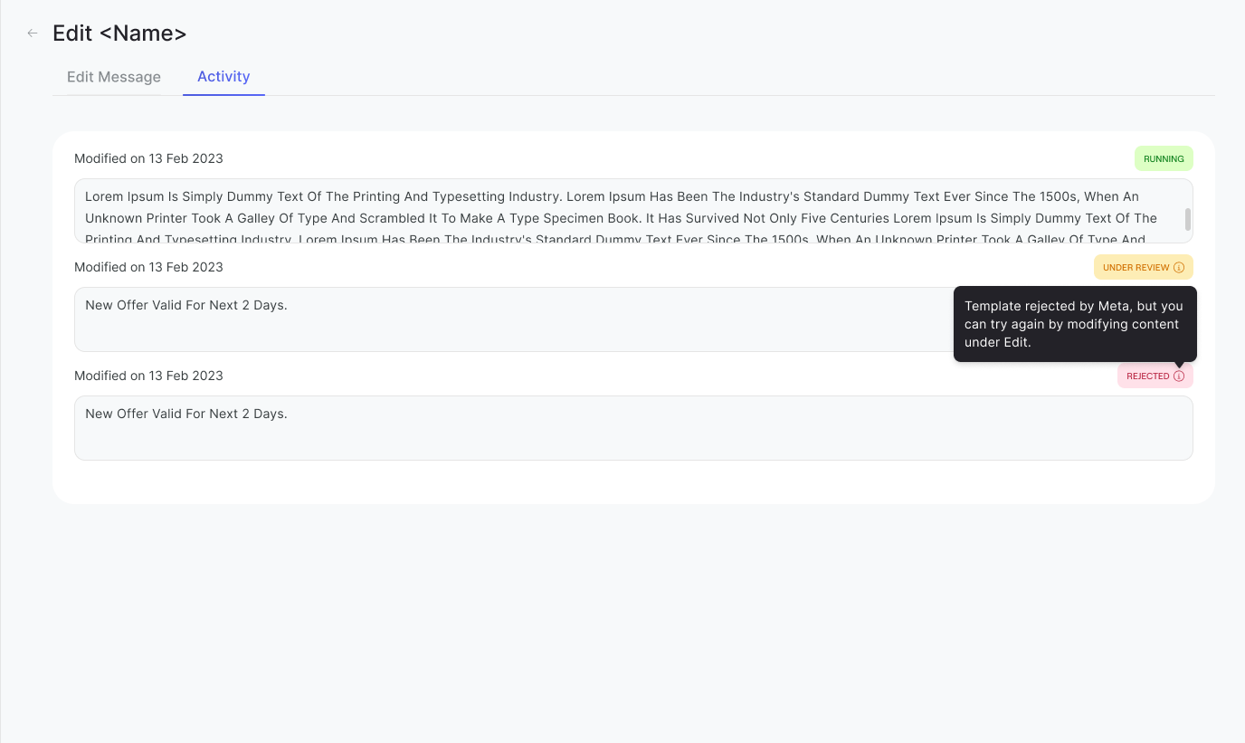 The Activity tab under Edit Message will give you a view on templates you edited, and their approval/rejection/review statuses. Note that you cannot send new templates if a template is under review. If rejected, can copy any of the activity content text and improve it, under Edit Message, and resend for approval.