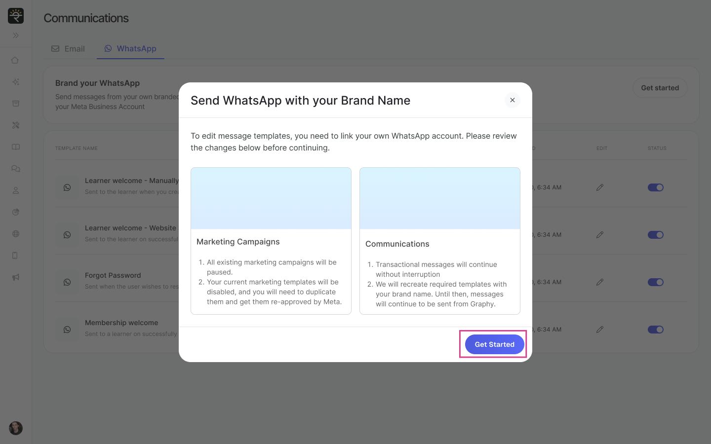 If you want to send Branded (in-your-name) WhatsApp communications, you need to brand your WhatsApp and link your Meta Business Account. Click on 'Get Started' to begin the setup process.