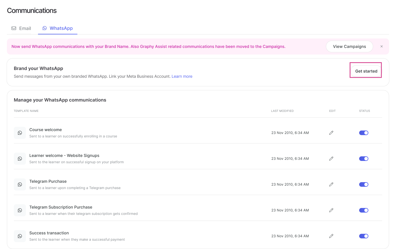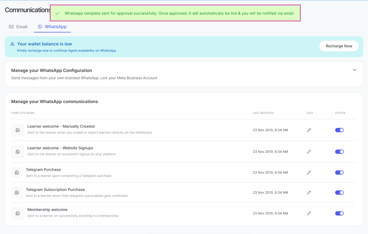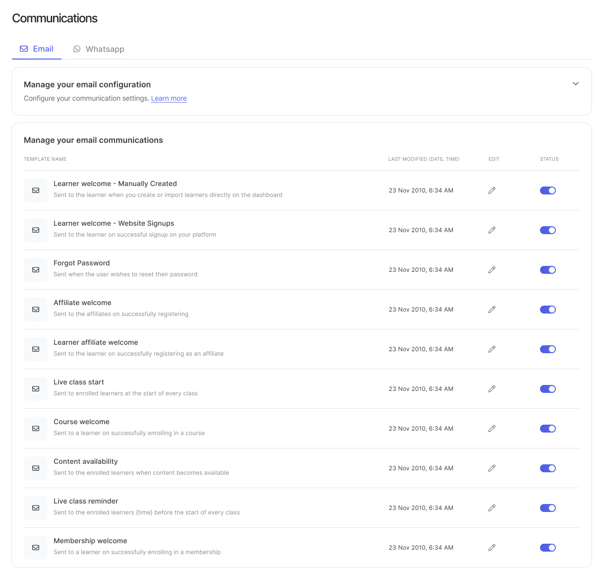 The Communications Section has been re-designed to provide a better experience of sending transactional communications to your learner bases. You can now manage your Email and WhatsApp communications from separate, dedicated tabs, making it more intuitive for you to configure and customize each channel independently.