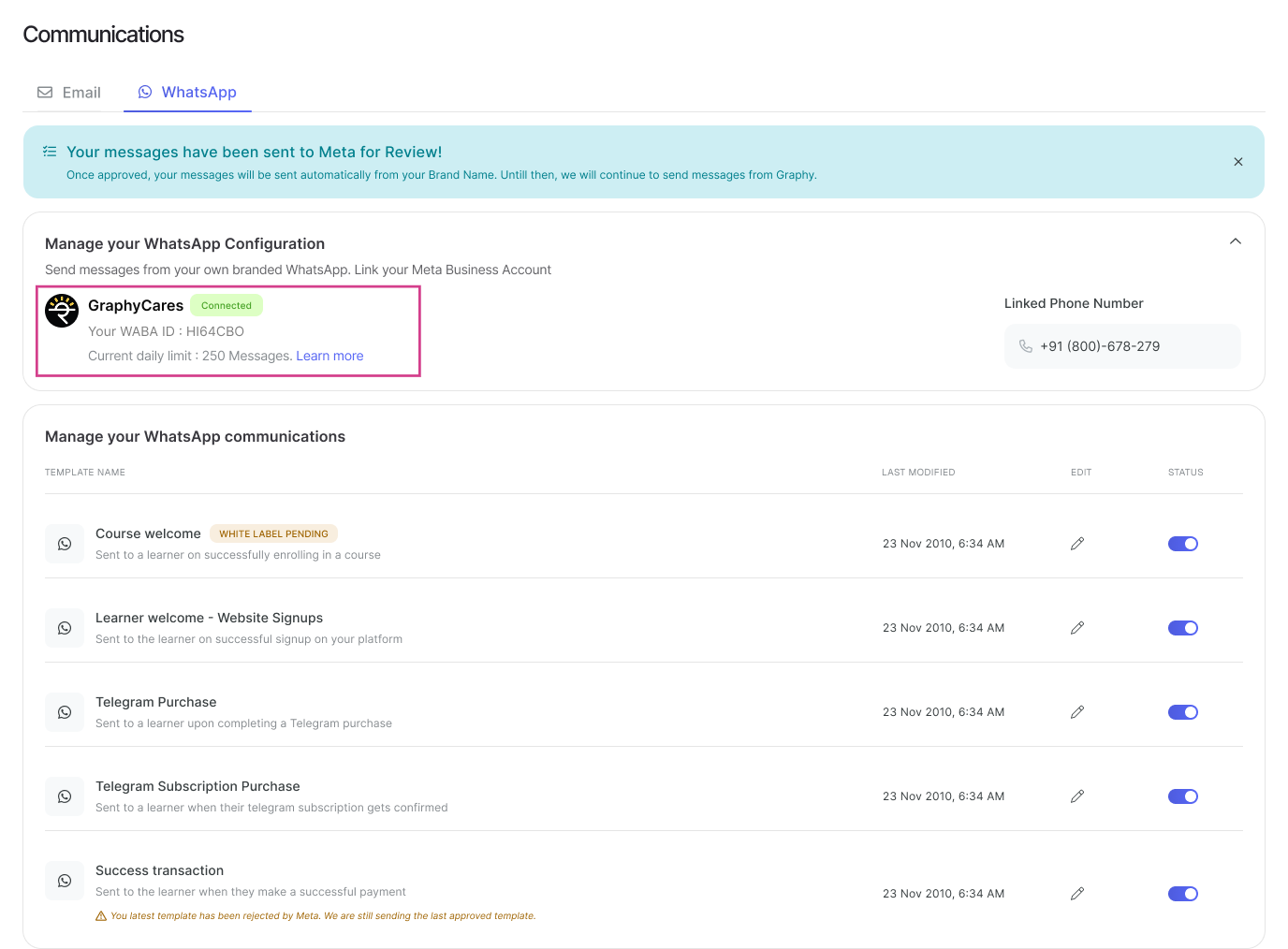 After submitting, your template gets sent for review by Meta. It will be live and running once approved. Until then, messages will continue to go in Graphy's name, if you have status enabled on a particular template.