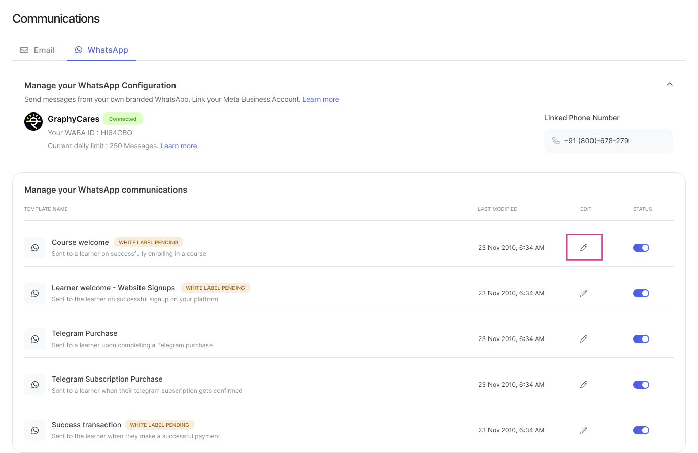 Click on 'Edit' to modify any WhatsApp message template. These templates are already made available for you, and you can make changes to it. Note that once you edit any template, these would go to Meta for approval on the changes, and there may be a waiting period of a few hours involved. If your template gets approved, the white-label pending tag will go away.