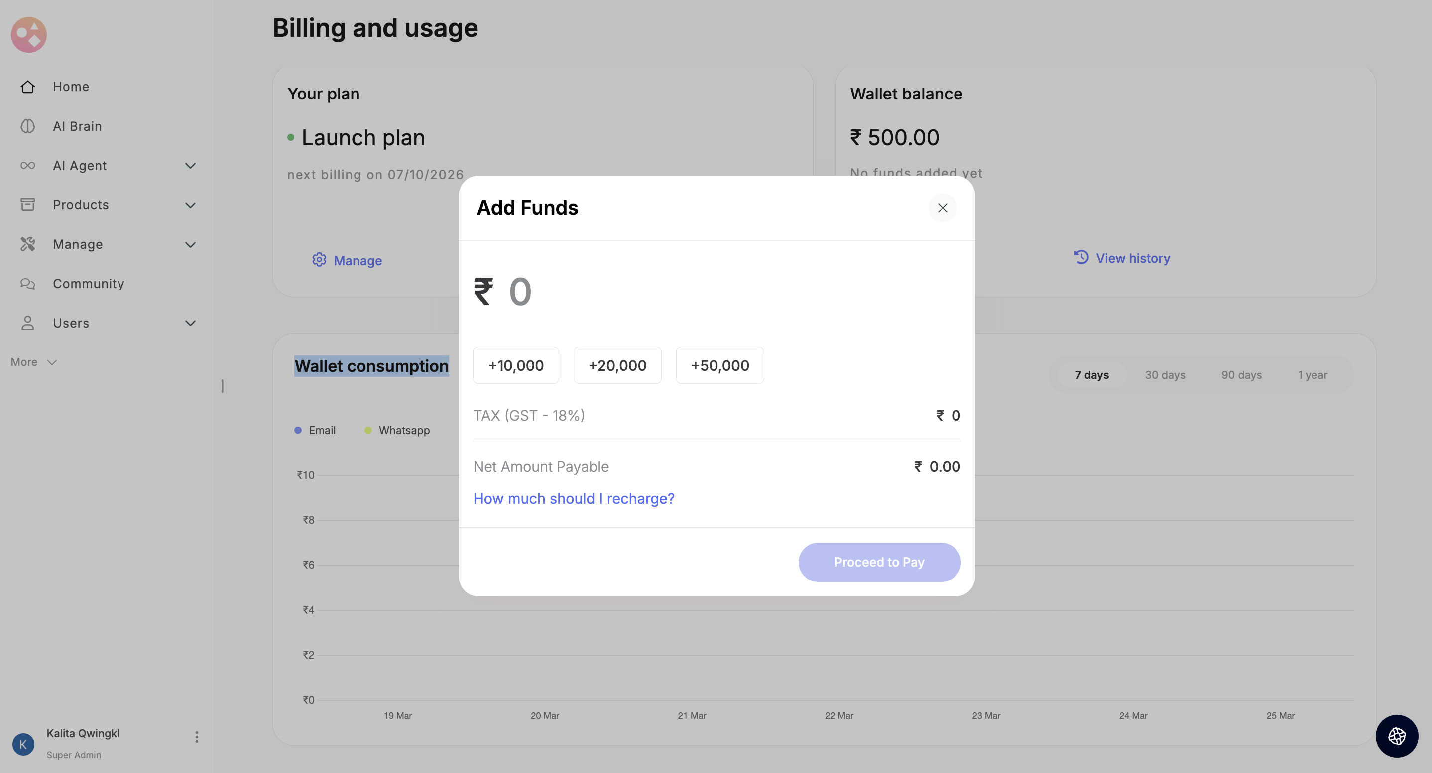 Note that sending communications to learners will have a cost and you need to keep your wallet recharged for this. You can do so under Billing and Usage> Wallet Balance > Add Funds.