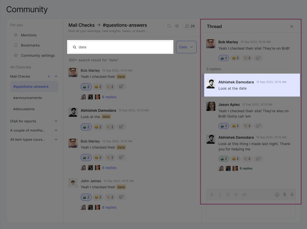 You can search for anything in the Community using our search feature. Just enter what you're looking for, and the relevant chats will appear. Your search term will be highlighted in the chat messages, and you can easily locate the same both on the conversation header.